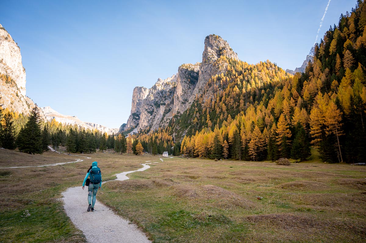 Vallunga is a walk through the park. The ascent is so gentle that you will hardly notice it. Walking through Langental is an excellent choice for a rest day. I included this hike on my autumn hiking trip itinerary across the Italian Dolomites.