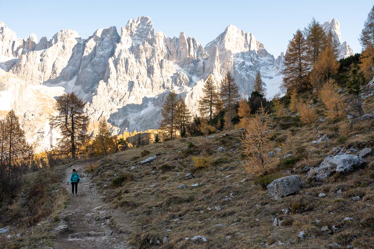 The larch trees filling Venegia Valley below were brightly coloured in yellows and oranges, creating a stunning atmosphere.