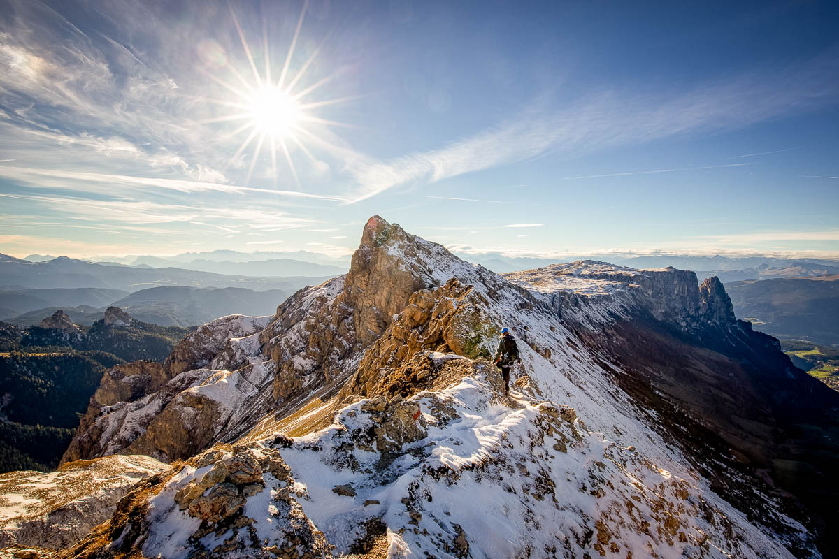Maximiliansteig starts at the luxurious Alpe Di Tires hut and traverses the Terrarosa ridgeline. The path stretches between two summits and has constant panoramic views of the Rosengarten group and the Alpe Di Siusi Altopiano.
