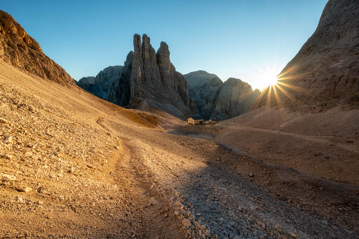 Once you reach the top of the chairlift, follow path 539, then 549 eastward toward Rifugio Roda da Vaél. It’s a flat jaunt and a great warm-up. It takes around 30-40 minutes to reach the hut.