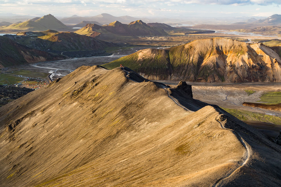 The hike up Bláhnjúkur can be turned into a loop. From the summit, you can continue along the ridge line to the other side of the mountain, down into the valley and back to the campsite past the Laugahraun Lava field.